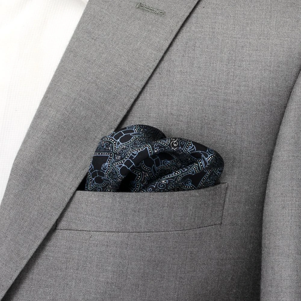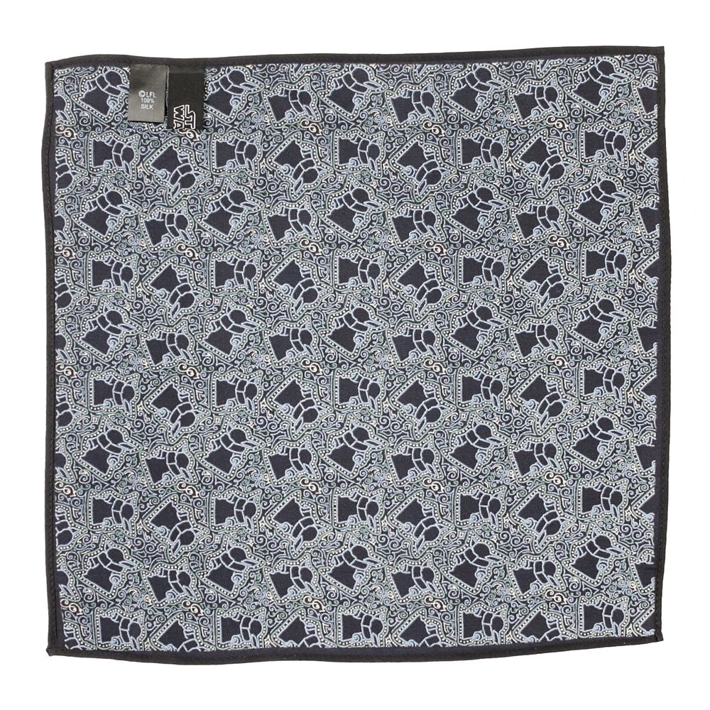 Little Grogu is featured in the allover design of this elegant silk handkerchief. The character from Star Wars: The Mandalorian is incorporated into a black and white filigree pattern, creating a stylish accessory to complement any suit.