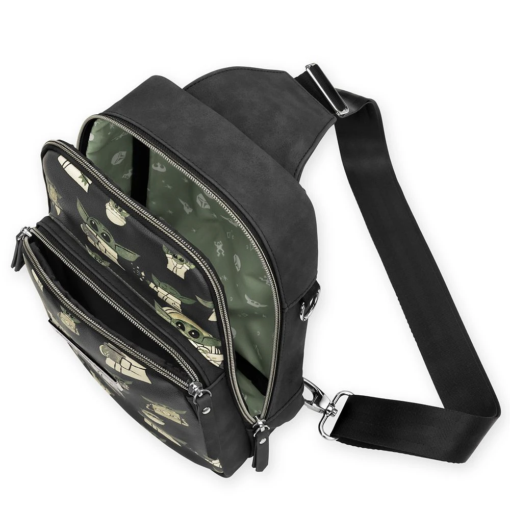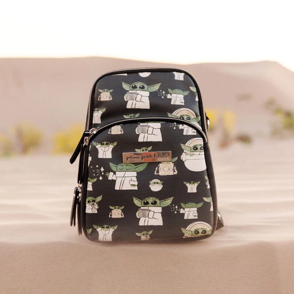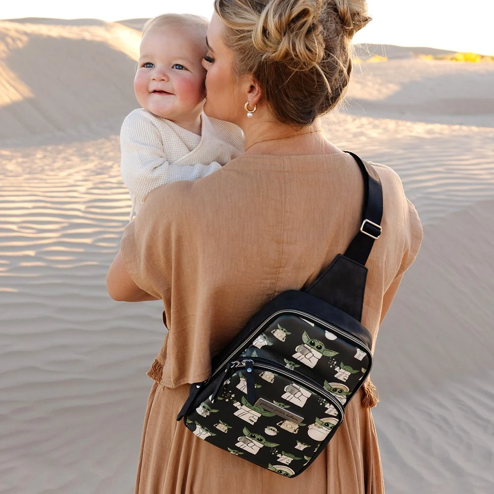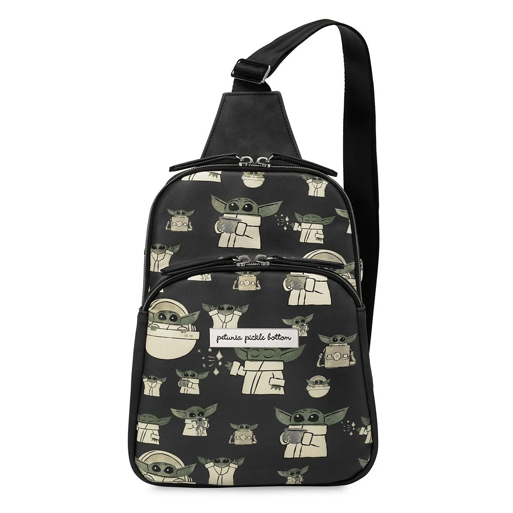 Little Grogu is familiar with being carried around in his hover pram, but now you can keep an eye on him everywhere you go with this sling bag from Petunia Pickle Bottom. Featuring an allover print of The Child, the Criss-Cross Sling has a light and compact design with cleverly placed pockets for all your essentials, and even a spare diaper and outfit in the spacious main compartment. Place snacks or a small bottle in the insulated front pocket, while a sleeve on the back is perfect for quick access to your phone.