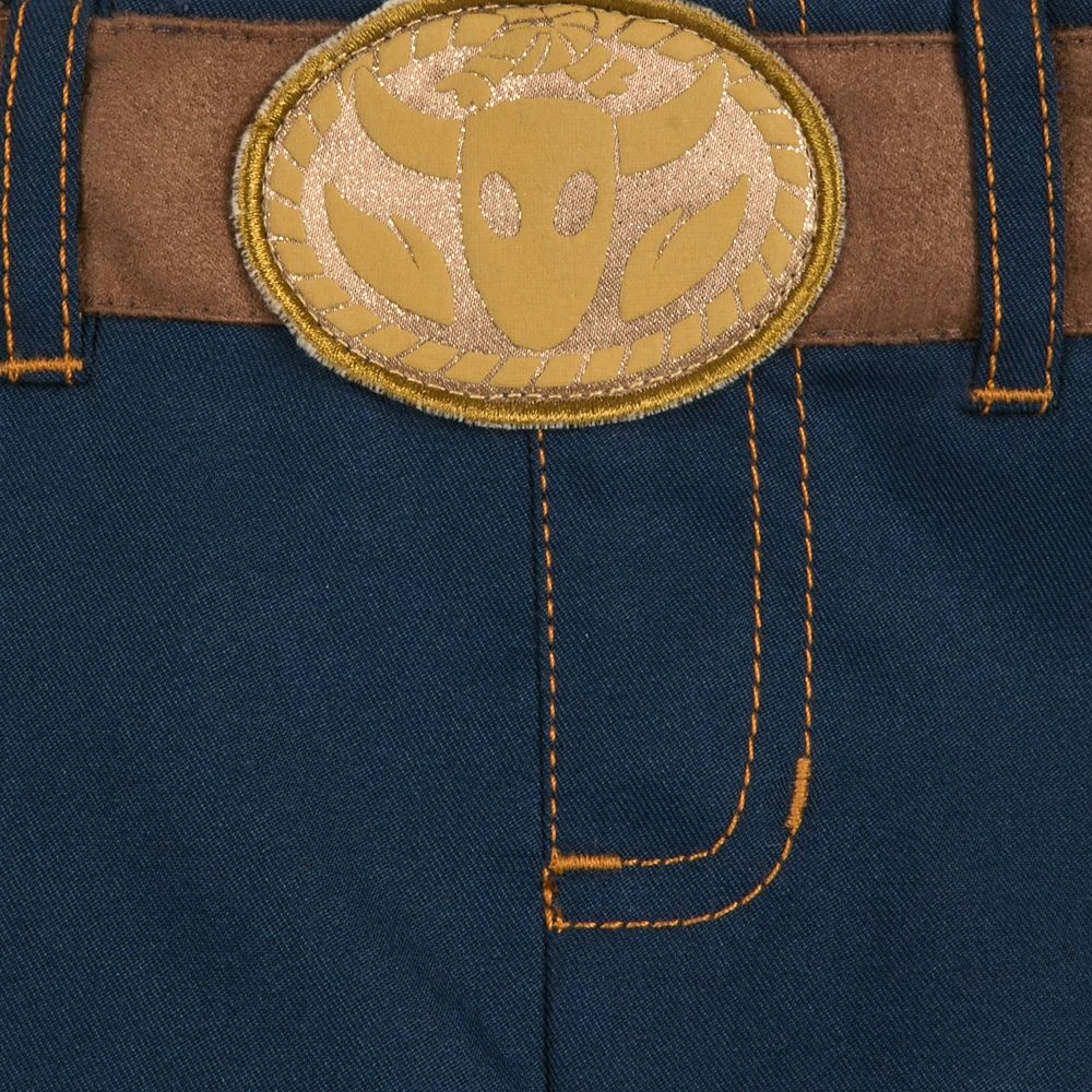 - Golden flecked faux-denim pants feature belt loops, elastic waist, decorative fly and attached faux suede belt with embroidered buckle and velvety faux cowhide chaps