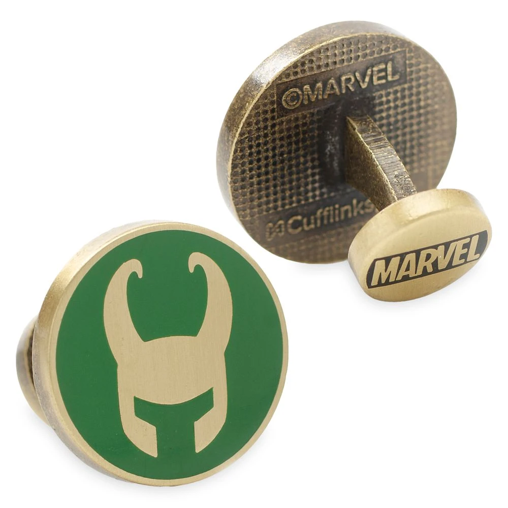 - Cufflinks feature green and gold enamel design of Loki’s helmet