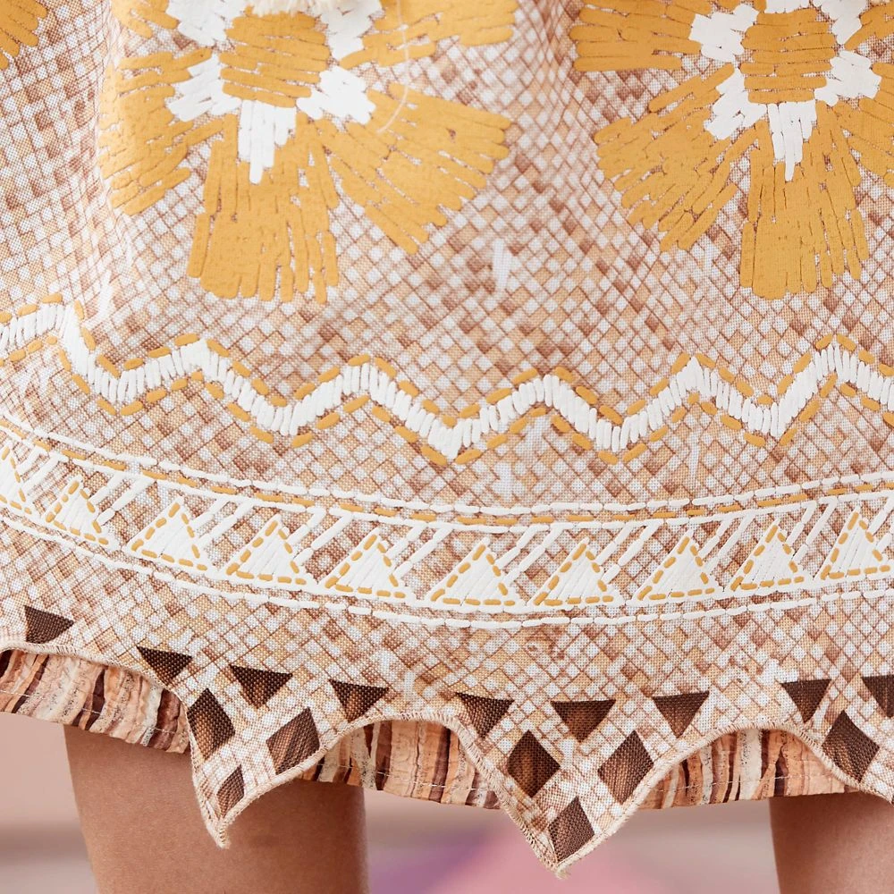 - Second layer with zig zag hem, Polynesian-inspired print, and raised puff ink screen art