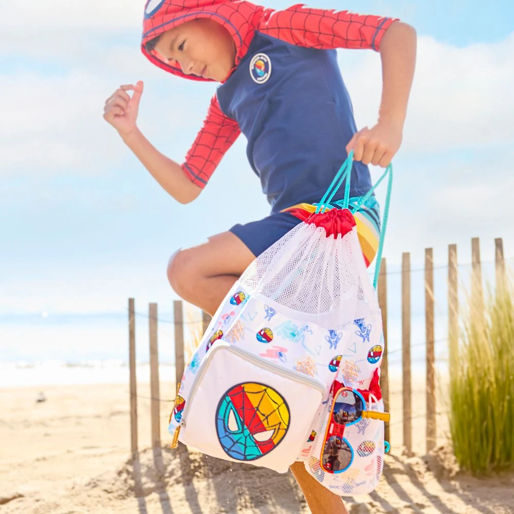 Swing into summertime action alongside your friendly neighborhood Spider-Man and this cinch-top swim bag to hold your suit, wet or dry, plus a zip compartment and a water bottle pocket to keep your heroics fully accessorized for beach or pool.