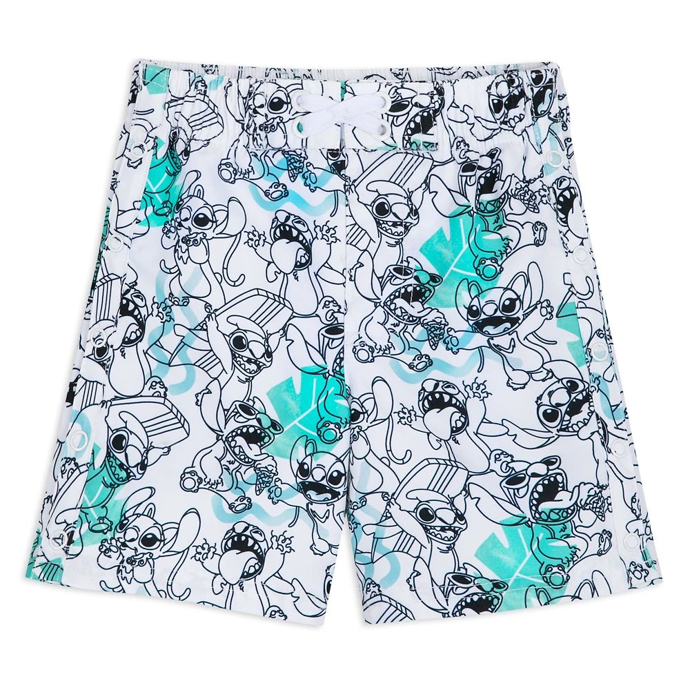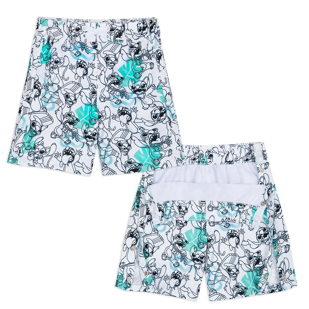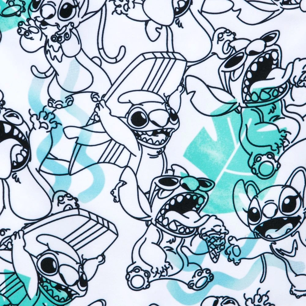 Stitch has certainly taken to his new life as he’s pictured enjoying many of the delights Hawaii has to offer along with his friend Angel on these swim trunks. The allover print features Experiment 626 surfing, playing the ukulele, and eating ice cream. Specially designed for ease of use, they have ring snaps on the side panels to provide a full opening and a metal grommet vent hole and self-stick fabric closure on the back. Not only will these provide company at the beach or pool, they’ll also provide UPF 50+ built-in UV protection.