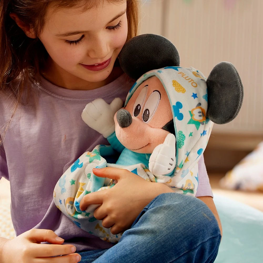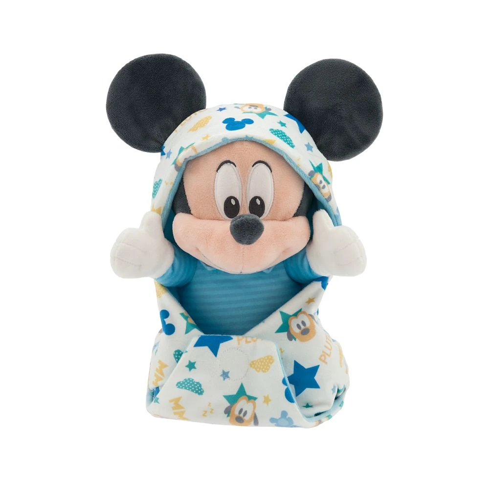 Our Disney Babies Mickey Mouse is a snuggly plush superstar. Baby Mickey wears adorable striped pajamas and is all wrapped-up in his reversible soft velour swaddle blanket with self-stick fabric closure. Why? Because he likes you!